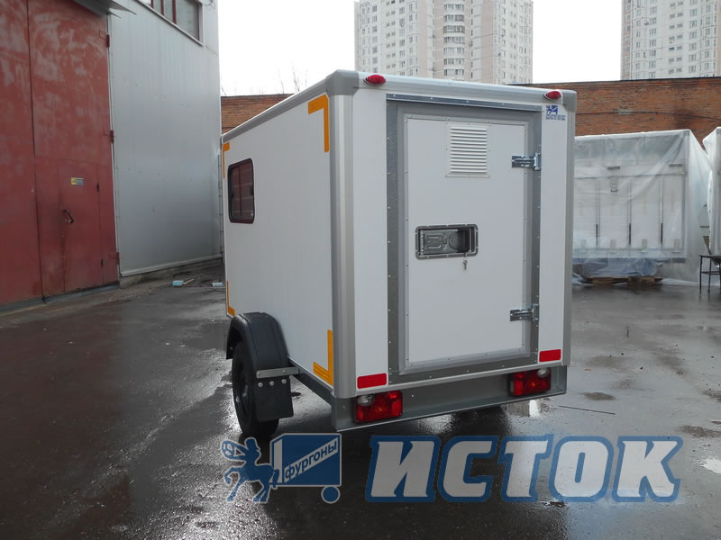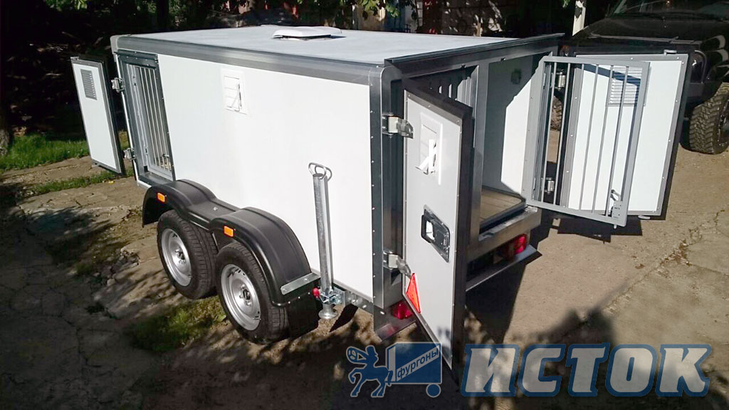 Конструкция прицепа представляет собой жесткостенный фургон, выполненный по сэндвич-технологиям. Толщина стенок фургона 30 мм. Используемые материалы огнеупорные и экологически чистые. В качестве утеплителя применяется экструдированный пенополистирол. На стенках армированный анти-вандальный немецкий пластик. Прицепы изготавливаются по индивидуальным параметрам, предоставляемым заказчиком, но есть и базовые варианты, уже нашедшие одобрения и положительные отзывы у владельцев собак. В качестве удобства, при открывании основных дверей прицепа, устанавливаются дополнительные дверные решётки со штанговыми внешними пружинными запорами (собака такой замок никогда не откроет). Основные двери изготовлены из тех же материалов, что и сам корпус фургона, т.е. по факту весь фургон приобретает изотермические функции и весьма удобен при изменении погодных условий. Зимой в прицепе - тепло. Летом - прохладно. Push замки, установленные в дверях фургона закрываются на ключ.
