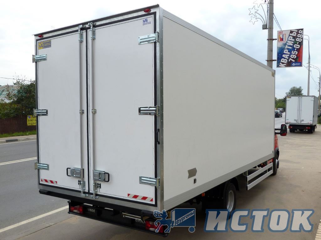 Автофургон на шасси «Iveco». Фургон выполнен из «сэндвич» панелей, утеплитель - пенополистирол экструдированный 50 мм, наружная обшивка пластик. Фурнитура оцинкованная «Nevpa», окантовка из анодированного алюминиевого профиля.